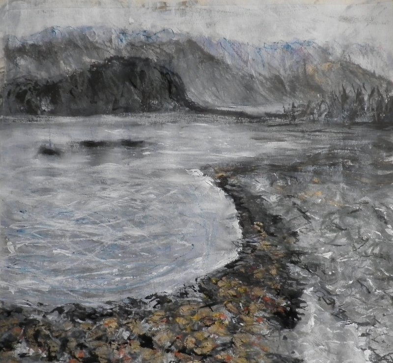 So this is how it looked this morning. What I thought I'd do was to start a coloured version and do a dark sky and sea. So I pulled out a piece of paper which already had some colour on it, and I made a fresh start, forgetting all about my abstract values (of course).